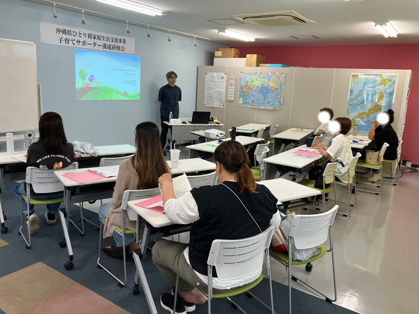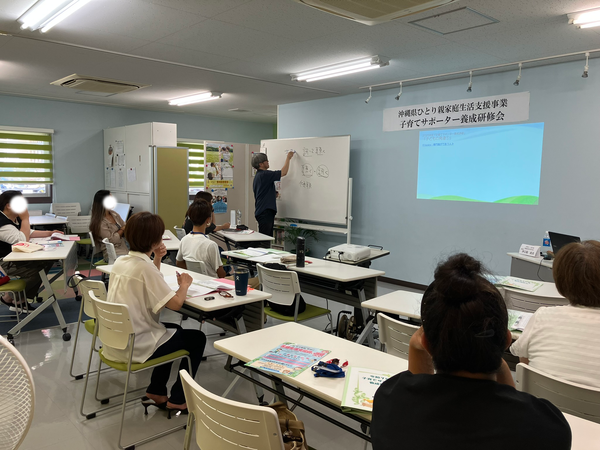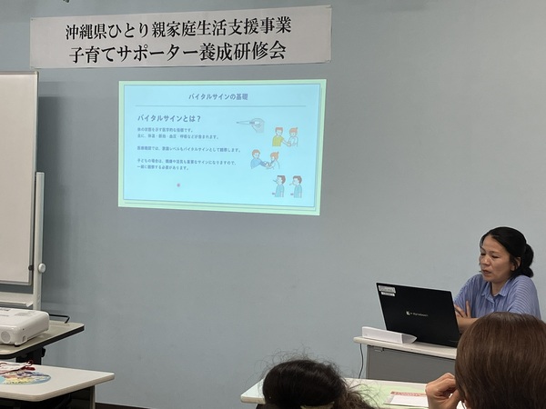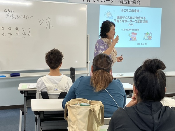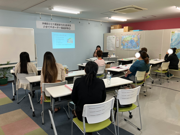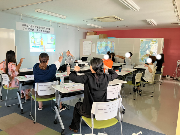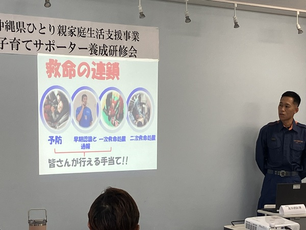 子育てサポーター養成研修会 2025.11.13 1.目的沖縄県ひとり親家庭生活支援事業利用者が、法定講座を受講することで、ひとり親家庭等、日常生活支援事業の家庭生活支援員やファミリーサポートセンターでのサポーターとして登録し、副収入を得て、経済基盤の安定を目指す。また、自らの育児能力を高めることも目的とする。2.事業内容子育てサポーターとしての教養を身に付け、育児に関するスキルの習得を目指す。3.受講期間10月4日~11月1日 計24時間4.講師(専門的技術を有する者) ・心の発達(仲宗根政貴 教諭) ・保育の心 心の発達(仲間優子 教諭) ・子どもの健康と病気への対応(山城正明 医師) ・子どもの世話(仲宗根由美 教諭) ・子どもの遊び(大城克也 教諭) ・安全/事故/チャイルドシートの必要性/AED(北谷消防署 米須一斗消防士) ・小児看護の基礎知識(山川和歌子 基礎看護助教) ・子どもの栄養と食生活(森山克子 傾聴カウンセラー・ライフコーチ) ・ファミサポネットゆくる(仲吉・謝花)受講者の声 ・子どもの対する見方、ものの見方なども気づきになりました。 ・生活する上で子育てする上で、すごくいい講座でした。 ・人との関わり方なども学べ、一緒に講座受講した人達とも意見交換でき、仲良くなれた。 ・先生方が個性的で楽しく話をしてくれ、充実していました。 < 親子 きくらげ収穫体験将来の職業について考えてみよう >